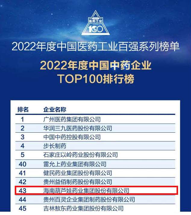 葫芦娃药业集团连续4年荣登“中国中药企业TOP100排行榜”,排名上升至第43位